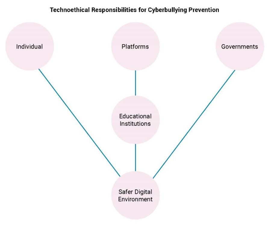 Figure 2. Technoethical Responsibilities Flowchart, highlighting the collaborative roles of individuals, platforms, governments, and educational institutions in addressing cyberbullying